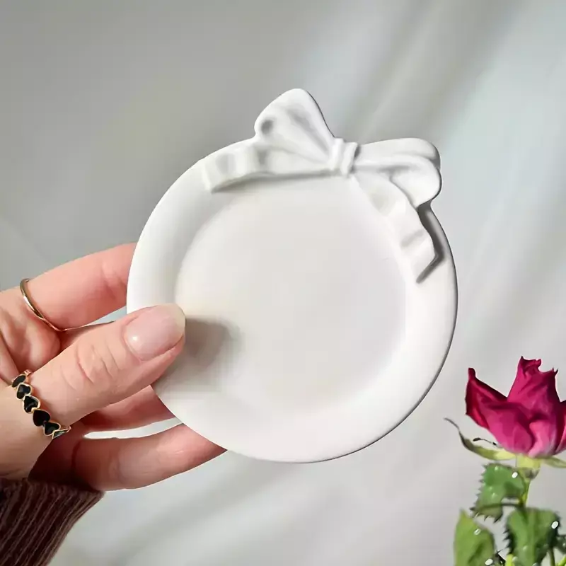 Descubrí el molde perfecto para potenciar tu creatividad: una bandeja redonda con un elegante diseño de moño, ideal para trabajar con yeso, resina acrílica y cemento.